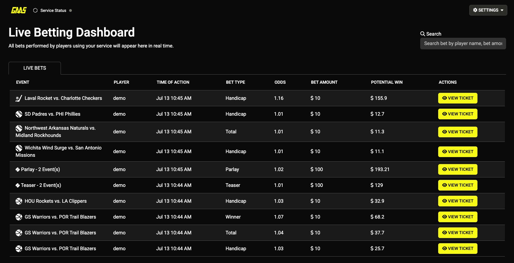 GAAS Bet Ticker gives you instant visibility into every wager as it happens. Designed for speed and clarity, it delivers a live stream of betting activity in a sleek, familiar interface—keeping you informed without disrupting your workflow. Stay alert, spot trends, and make smarter decisions with a tool built for today's fast-moving sportsbook operations.